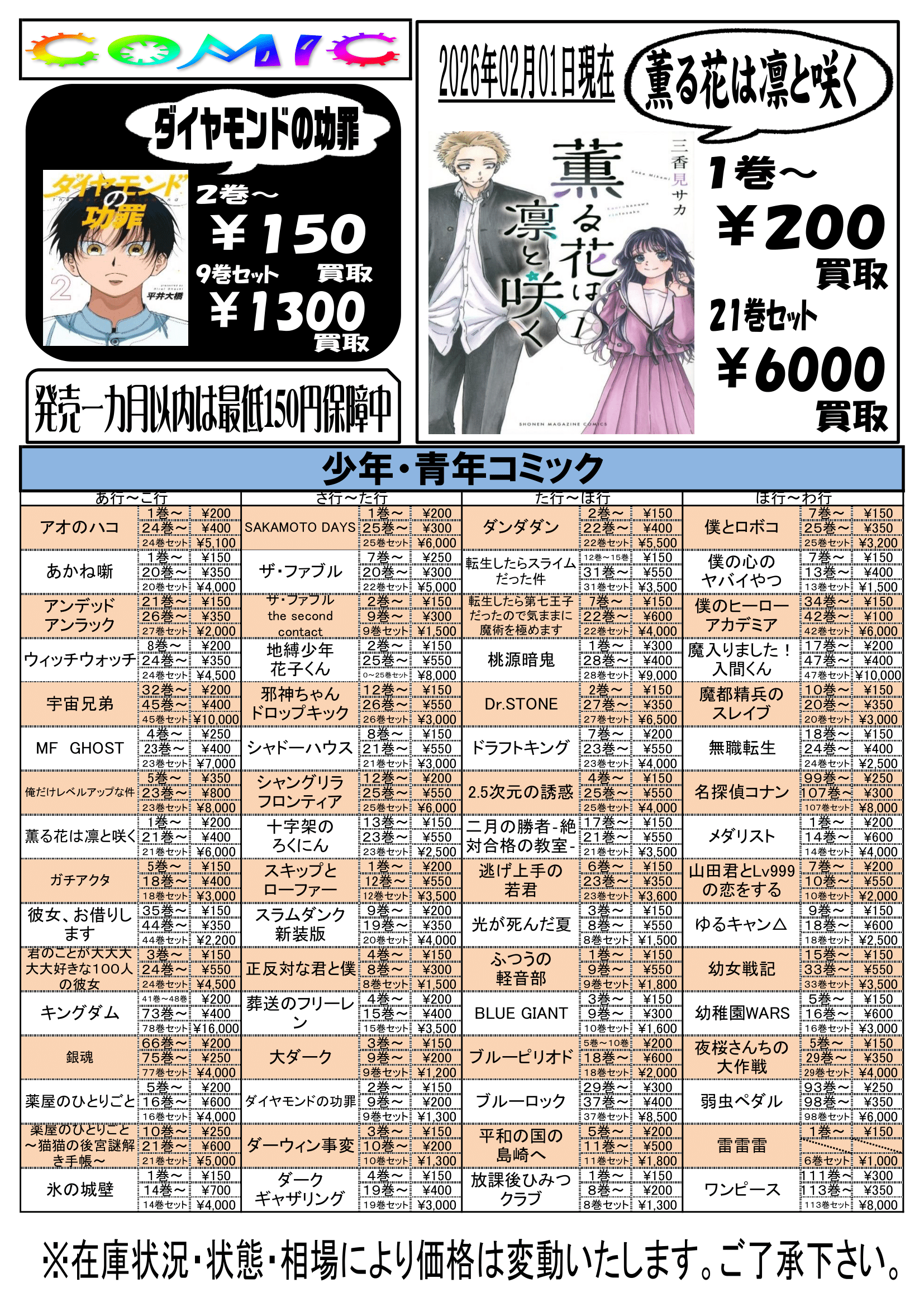 【2月更新】コミック2月買取情報①あ行~わ行