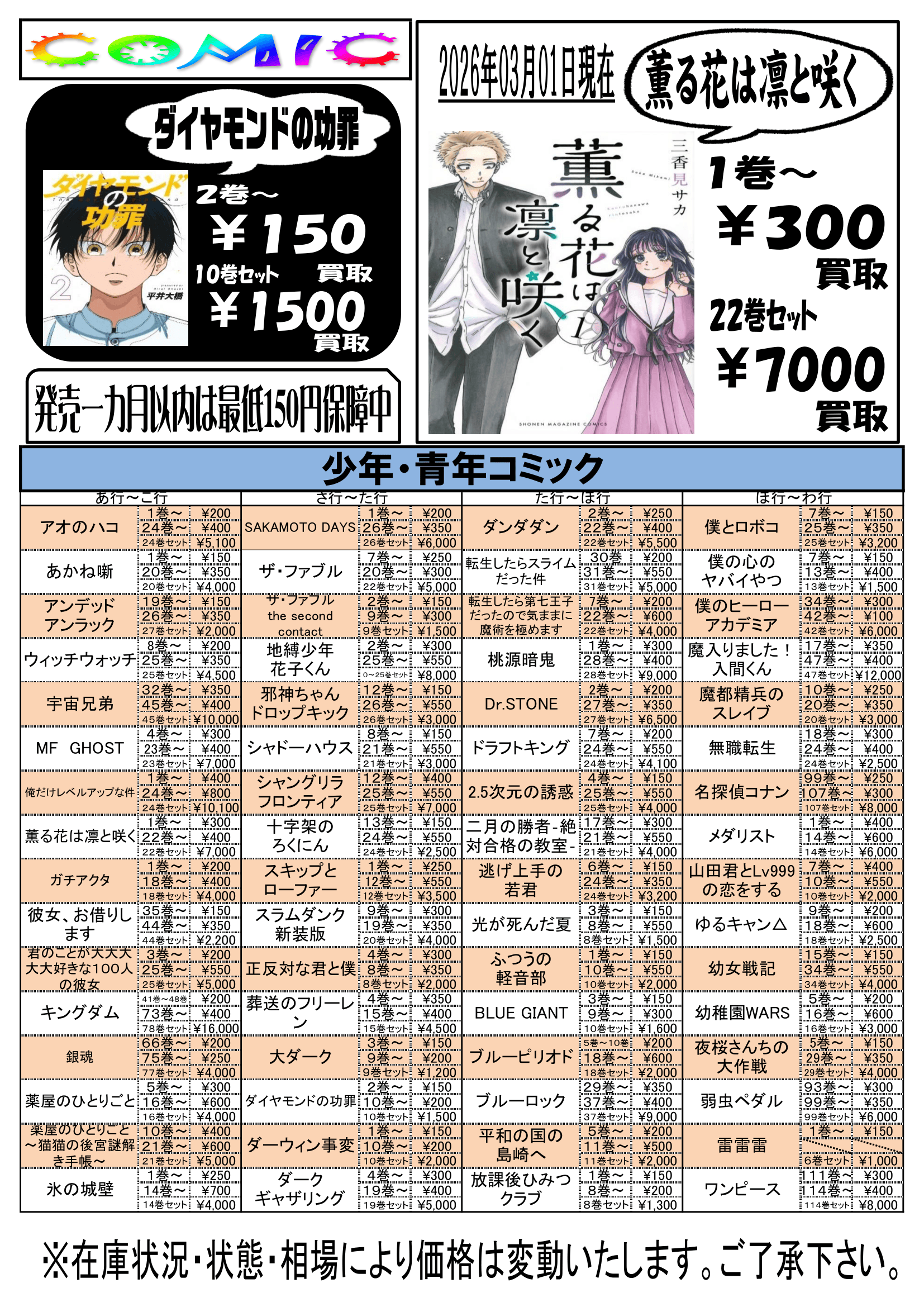 【3月更新】コミック3月買取情報①あ行~わ行