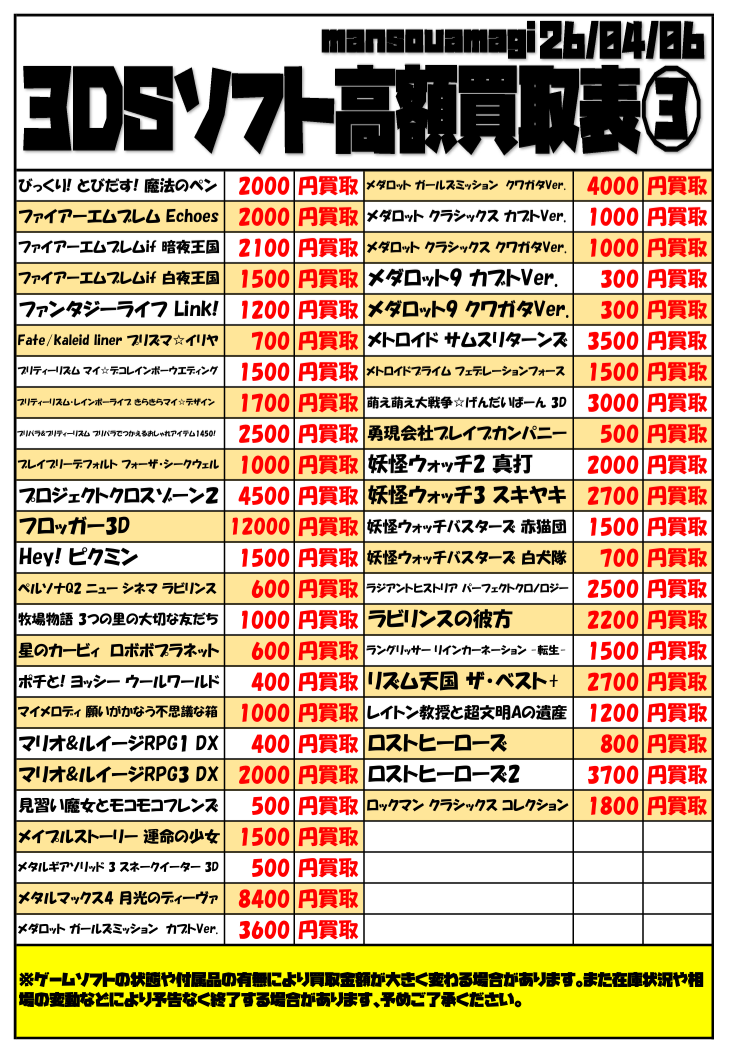 令和8年 任天堂3DSソフト買取表③