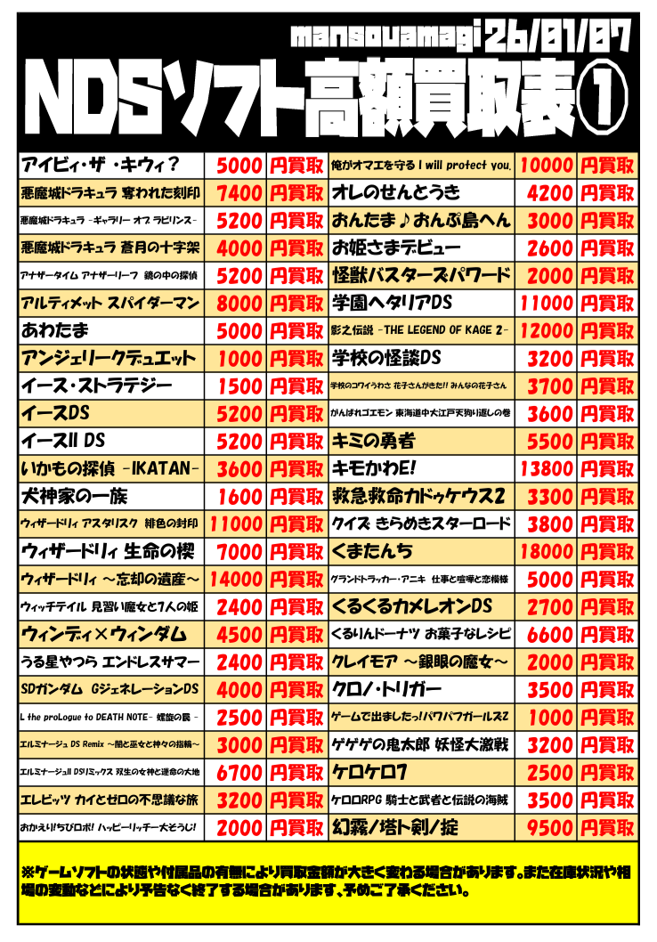 令和8年 任天堂DSソフト買取表①