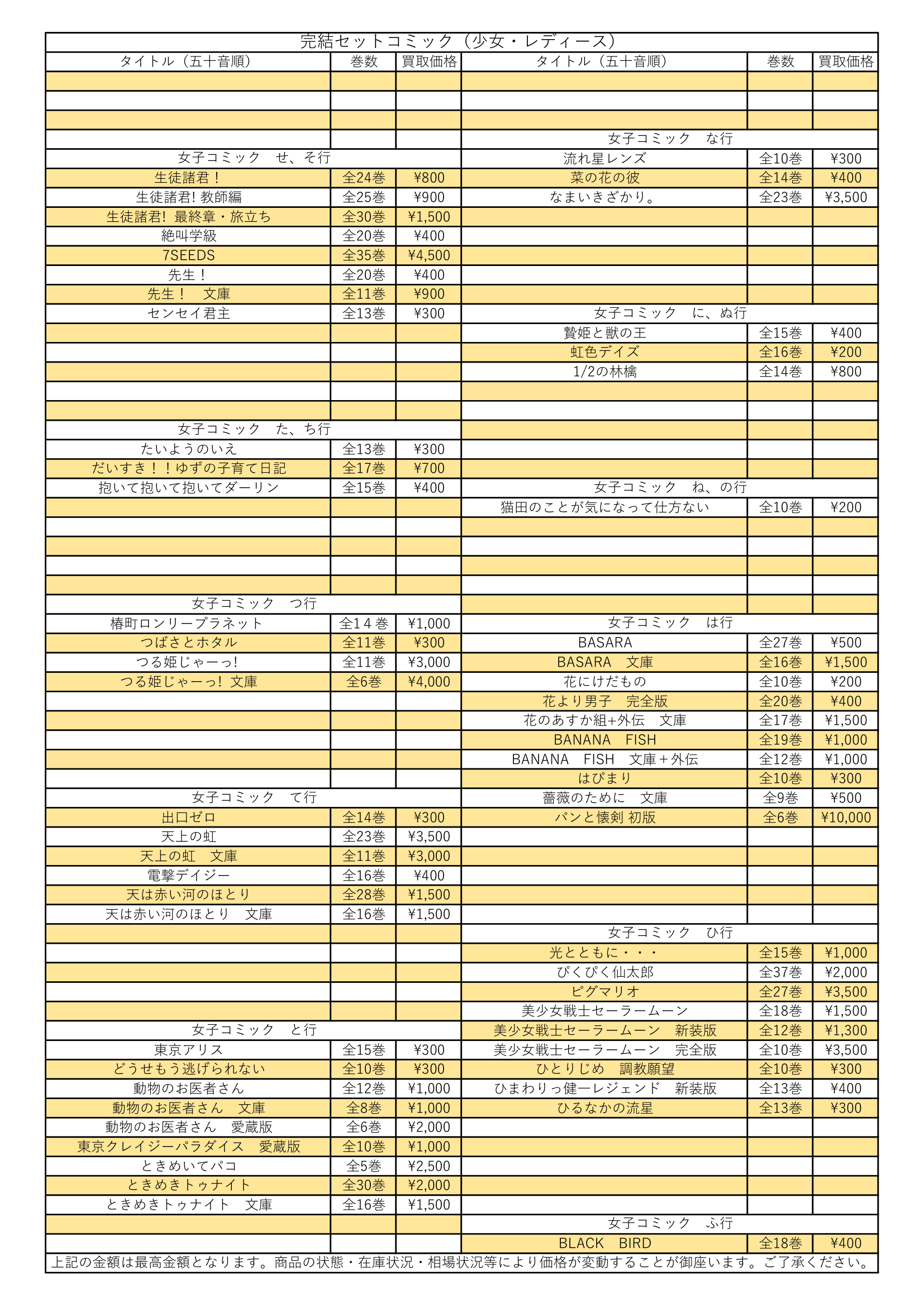 女子コミック完結セット買取情報【せ行~ふ行】