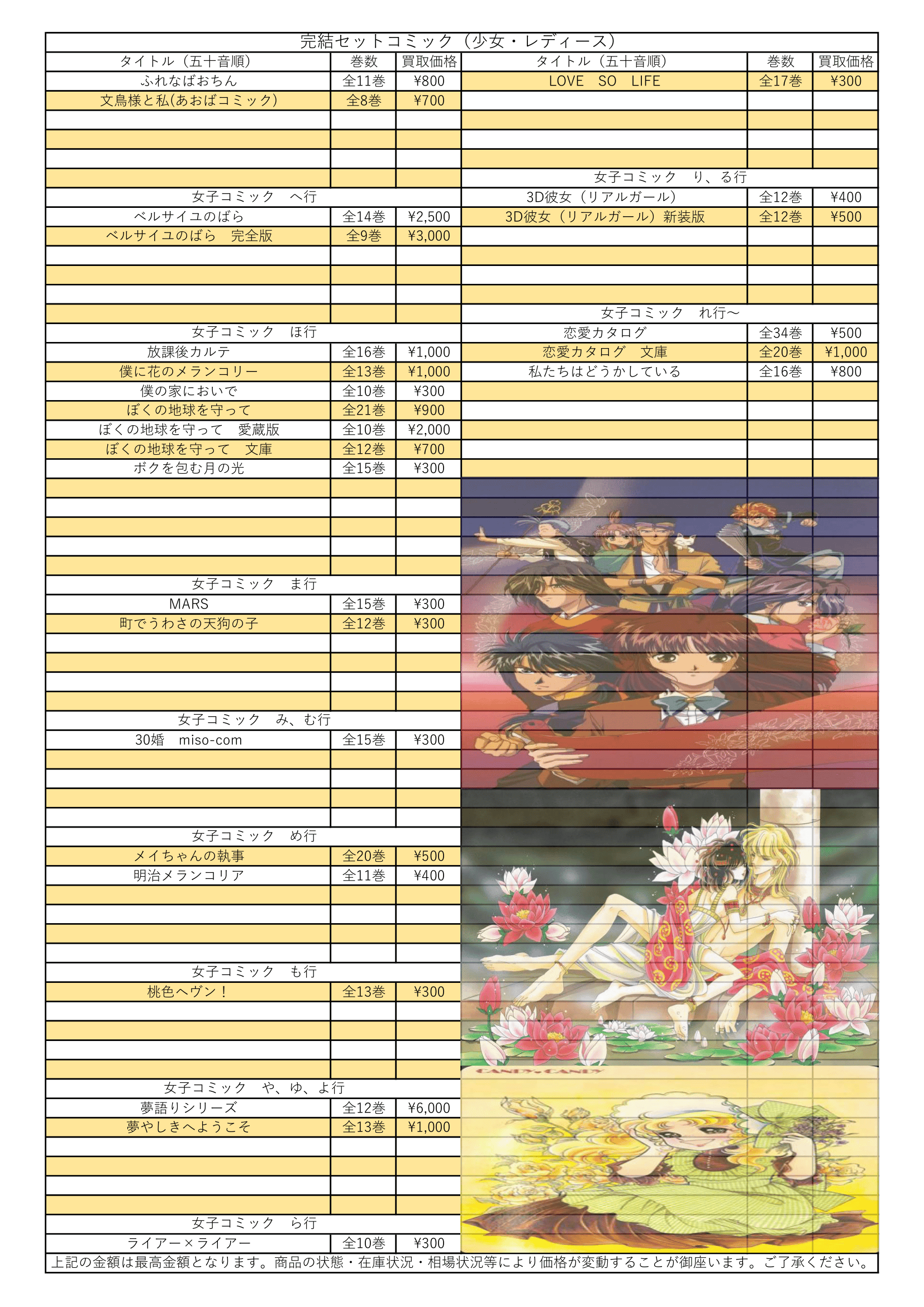 女子コミック完結セット買取情報【ふ行~わ行】