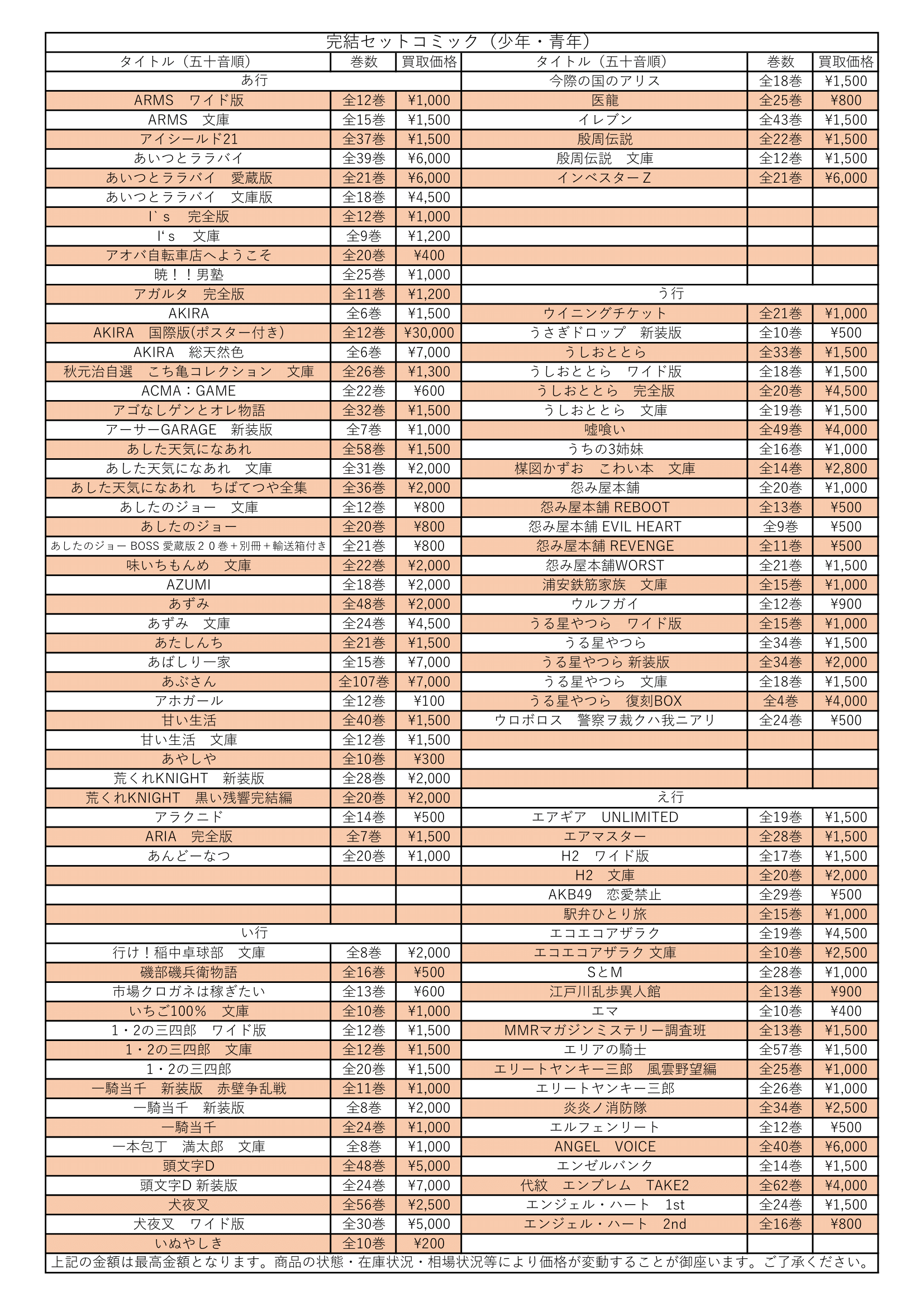 男子コミック完結セット買取情報【あ行~え行】