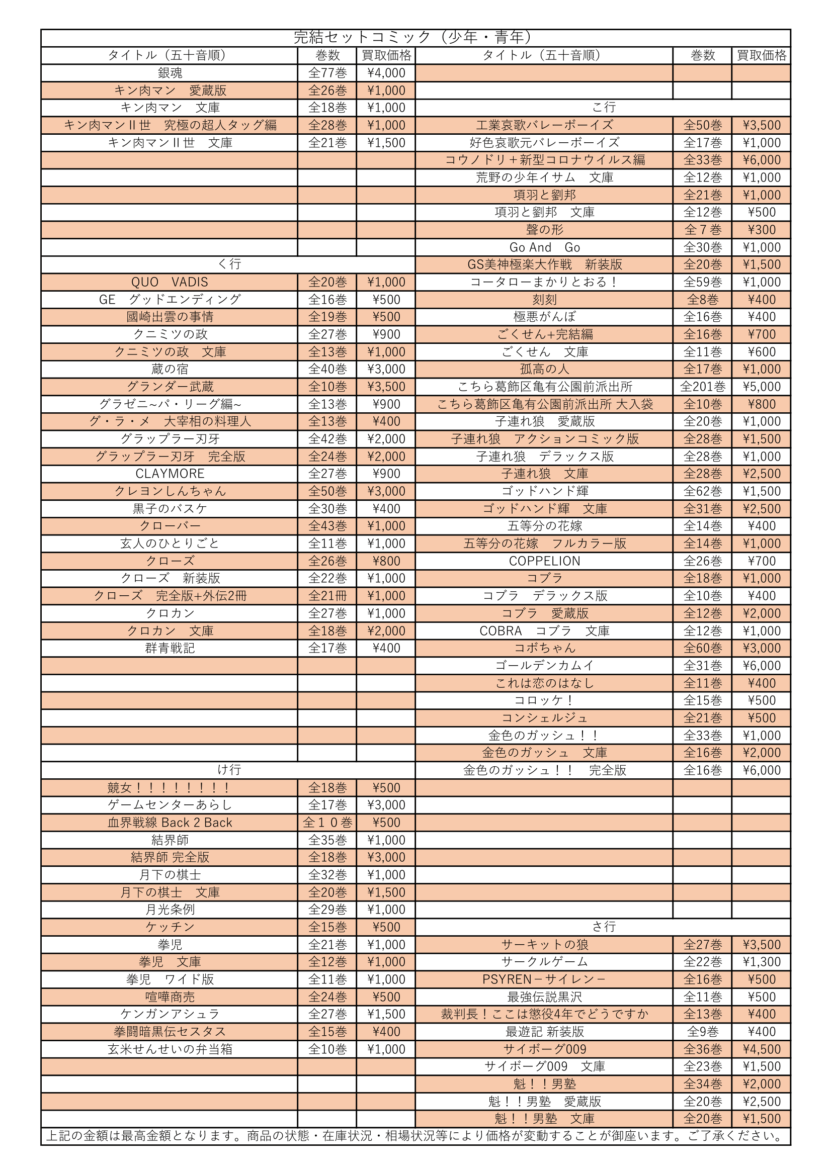 男子コミック完結セット買取情報【き行~さ行】