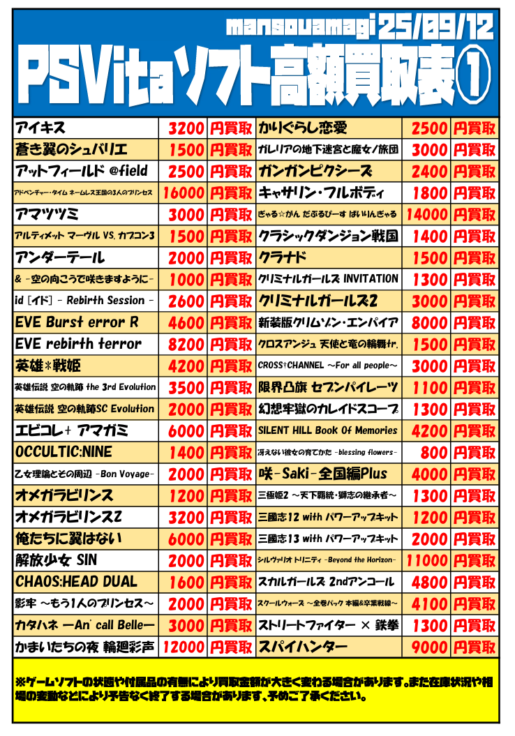 playstationVitaソフト買取表①