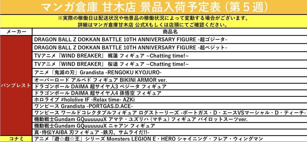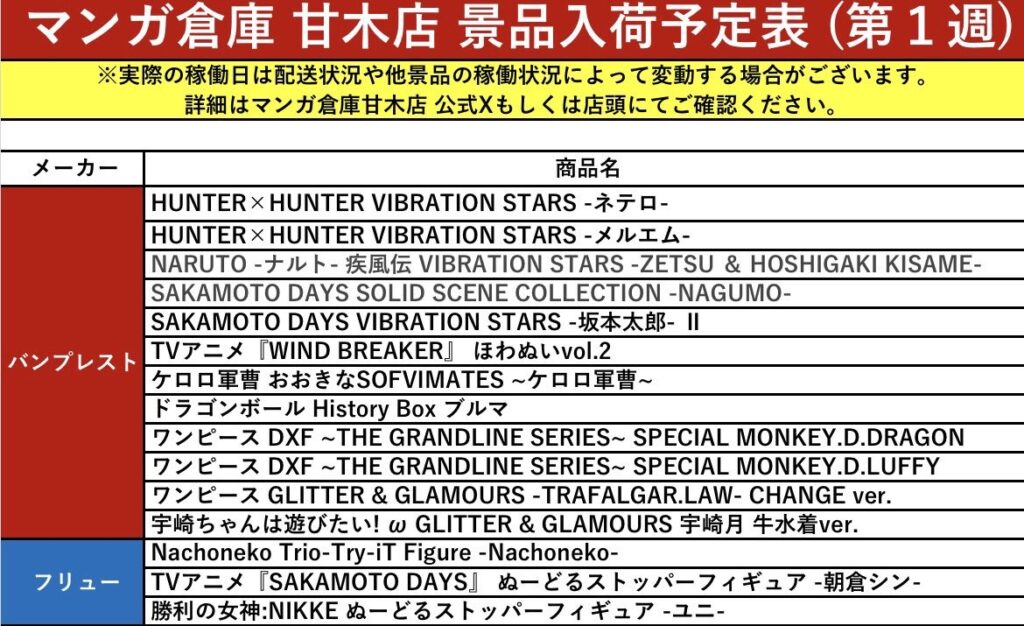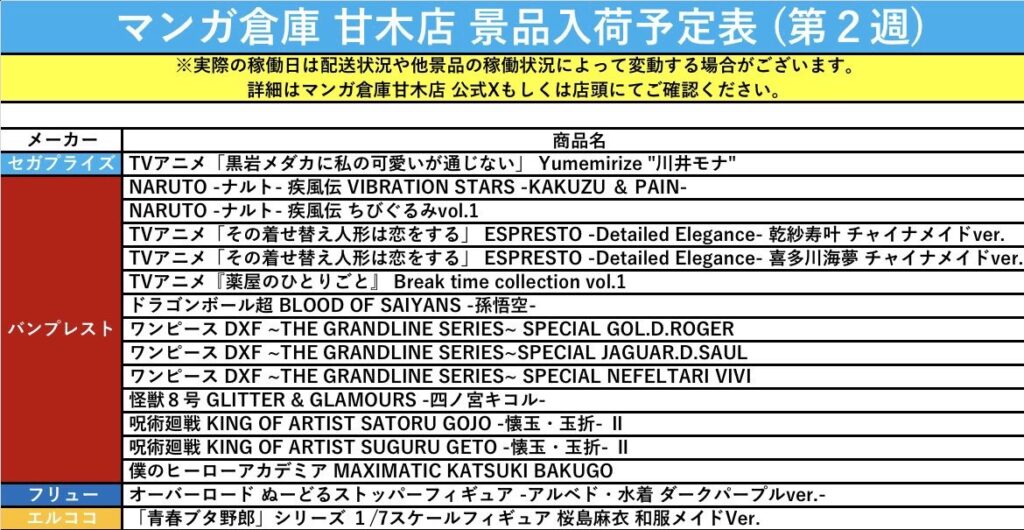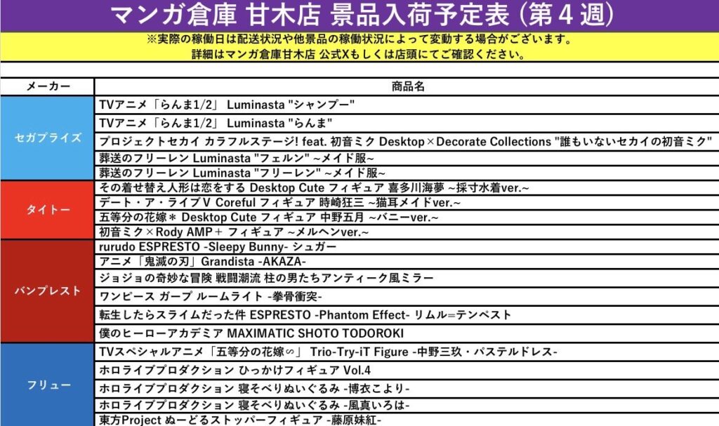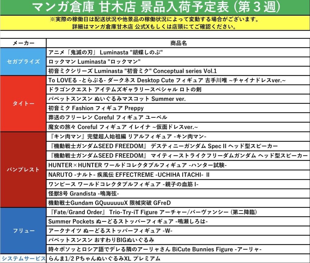 202506.27 新着情報 アミューズメントコーナーより7月の新景品の入荷予定情報!! マンガ倉庫甘木店の7月の新景品入荷予定一覧(第1週~第5週)です! ※様々な事情により稼働日は前後する場合がございます※その他雑貨・食品系も入荷予定です