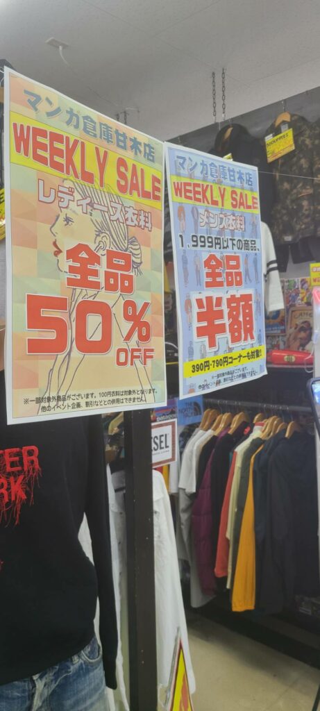 202507.09 新着情報 古着コーナーから『今がチャンス! オ・ト・ク到来』のお知らせ! レディース衣料全品半額!! 1,999円以下のメンズ衣料も全品半額!!すでにお得な『390円、790円』コーナーも半額対象となります♪ ※一部対象外、他イベント/割引との併用不可となります。詳しくは店内POPをご確認くださいませ。 これからも夏に負けないアツいイベントをお届けしていきます(^-^)/ マンガ倉庫甘木店ではお客様のご来店をスタッフ一同心よりお待ちしておりますo(^o^)o
