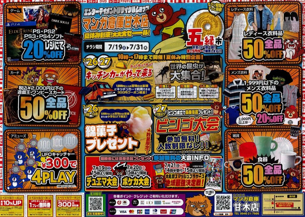 202507.19 新着情報 🎉【7/19(土)〜7/31(水)】夏休みロングセール開催! 🎉【7/19(土)〜7/31(水)】夏休みロングセール開催! お子さまから大人まで楽しめるアイテムが勢ぞろい!この夏のお買い物は、ぜひ当店マンガ倉庫甘木店へ! “お得”と“ワクワク”が詰まった期間限定セールをお見逃しなく。 ※期間中は、ちょっと嬉しい企画もご用意しております♪ ぜひ一度マンガ倉庫甘木店へお持ちくださいませo(^o^)o