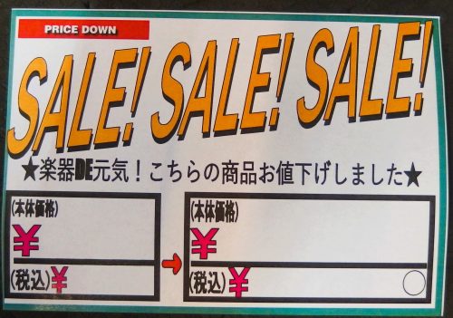 ただいまガッキコーナーでは写真でもUPしておりますプライスダウンのセールPOPが