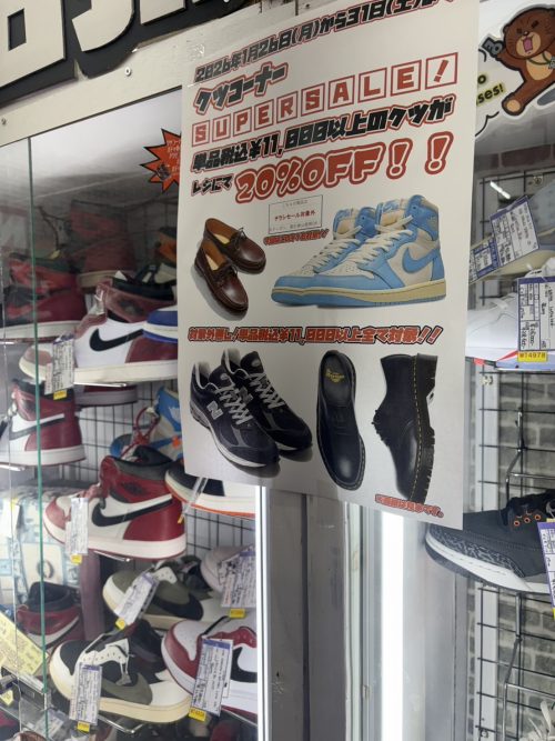 202601.26 イベント情報 ★《1月31日まで》クツコーナよりセールイベントのお知らせ!★ クツコーナよりセールイベントのお知らせ! 1月26日から1月31日まで単品税込価格¥11,000以上のクツがレジにて20%オフ!! メンズ、レディースはもちろんスニーカー、ブーツ、サンダルも対象!ご来店の際はぜひクツコーナーもお立ち寄りください!