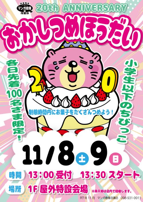 202511.05 イベント情報 ★《11月8日・9日》🎉20thお菓子つめ放題🎉★ 🎉20thお菓子つめ放題🎉 まんそー泡瀬ついに20歳‼️20周年記念に感謝の気持ちを込めてお菓子つめ放題を開催します👏😚ちびっ子たち、マンガ倉庫泡瀬店に集まれ〜〜‼️😋🙌 11月8日㈯9日㈰13:00〜受付13:30〜つめ放題スタート 小学6年生までのちびっ子各日100さま限定😳無料でお菓子つめ放題に参加できます😉🫶 今週末はマンガ倉庫泡瀬店でお菓子をGETしちゃおー‼️🥹 いつもと開催時間がズレてるので、間違わないでね!🙌