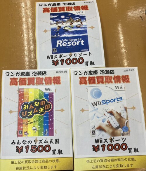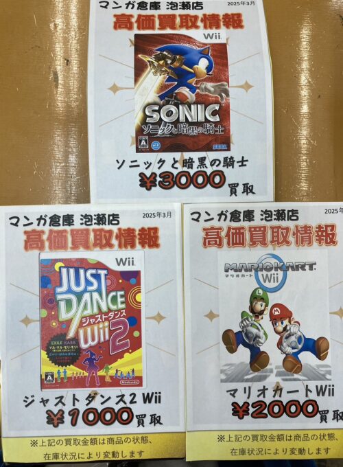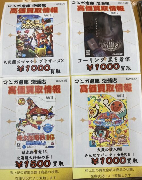 202503.21 買取情報 ★ただいまWiiソフト買取強化中!★ ★マンガ倉庫泡瀬店ゲームコーナーより★ ただいまWiiソフト買取強化中! 気になる方は是非、マンガ倉庫泡瀬店までお越しください! ※2025/3/21 現在の価格となります。在庫状況などによってお値段が変動いたします。予めご了承ください。