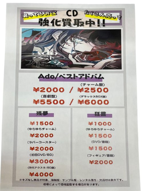 202511.11 新着情報 ★Adoの CD強化買取中!!★ 【買取情報/音楽映像】 Adoの CD強化買取中!! 指定タイトルを3枚以上のお持込で査定額UP!(条件有り) ※商品状態・在庫・相場により価格変動する場合があります。 ※2025/11/11 現在の価格となります。