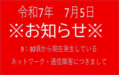 202507.05 新着情報 【重要】当店のネットワーク回線不具合に関して【重要】 9:30ごろから発生していたネットワーク・通信障害ですが、13:55に復旧いたしました。 お客様には大変ご迷惑をおかけした事をお詫び申し上げます。 🙇マンガ倉庫泡瀬店🙇