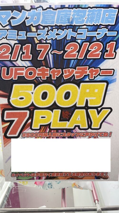 202502.17 イベント情報 アミューズメントコーナーから超お得な平日イベント! マンガ倉庫泡瀬店アミューズメントコーナーから超お得な平日イベント! 2月17〜21日までなんと500円7プレイイベントやっちゃてます! 欲しかったあの景品もこのイベント使ってたくさんGETしちゃってください!ぜひぜひマンガ倉庫泡瀬店に遊びに来てねー!
