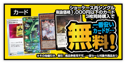 税抜1,000円以下の商品3枚同時購入毎に一番安い商品が無料!!