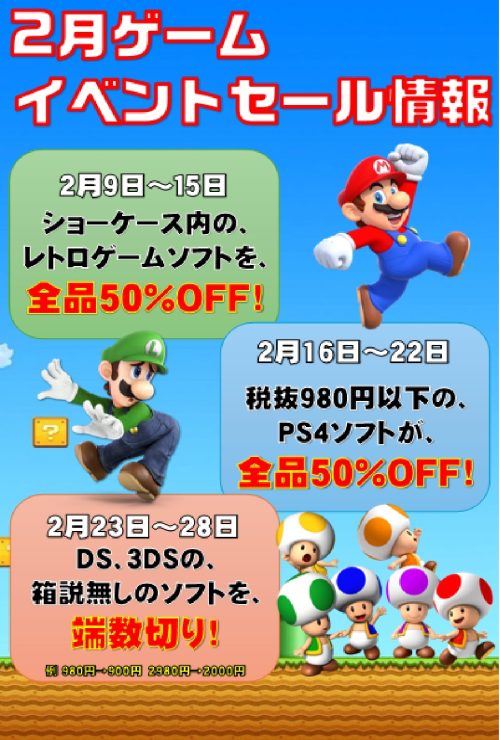202602.07 ゲーム ゲームコーナーから、週替わりのセールお知らせ! 2月はゲーム―コーナーで各週でセールを実施いたします! 2月9日~15日の第一弾は、ショーケース内のレトロゲームソフト、全品50%OFF! 2月16日~22日の第二弾は、税抜980円以下のPS4ソフトが、全品50%OFF! 2月23日~28日の第三弾は、DS、3DSの箱説なしソフトが、表示価格の端数切り! 例:980円→900円、2980円→2000円 それぞれ、お得なセールをご準備しています、気になるセールがあったら、是非マンガ倉庫泡瀬店に!