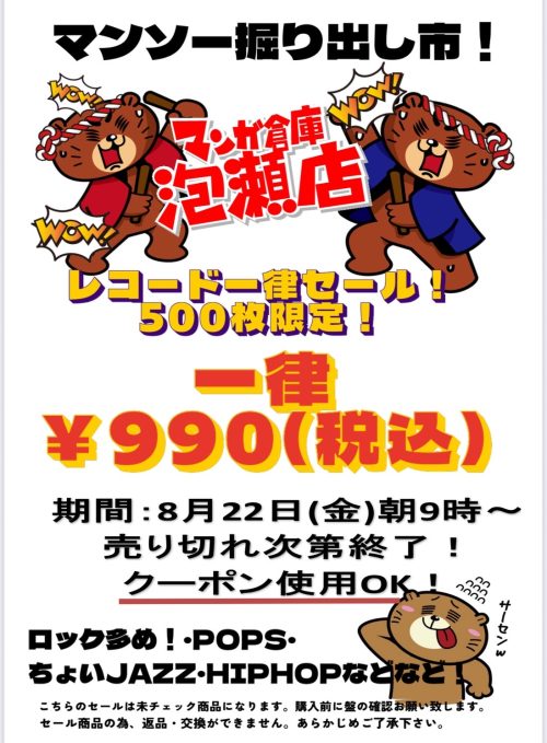 202508.22 新着情報 レコードコーナー 厳選!500枚限定!一律セール!! 【新着情報】レコードコーナーより厳選!500枚限定!一律セール! 【内容】一律¥990(税込)!洋楽ロック多め!Jazz・soul・Popなどを販売中!ご来店お待ちしております! ※商品は未チェック商品になります。購入前に必ず確認お願いします。ご不明な点等ありましたら、レコード担当をお呼びください!