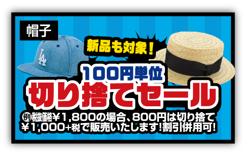 202507.12 イベント情報 帽子端数切りセール! 7月19日(土)~7月21日(月)まで 1000円以上の帽子が対象! 100単位以下切り捨てセール! 日差しから頭をガードせよ!! 新品商品も対象です!!