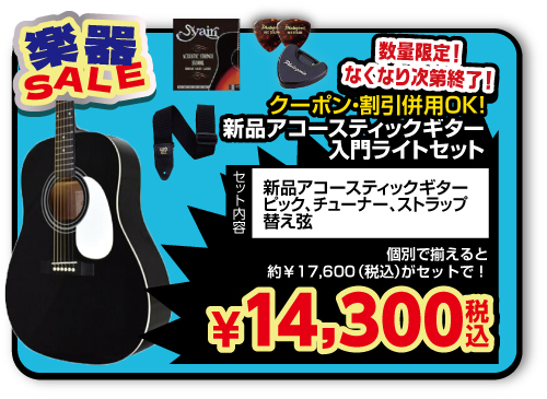 202604.11 楽器 楽器コーナーチラシイベント!! 春!!新年度始まりました!! これから新しい事始めませんか? マンガ倉庫楽器担当から提案があります!! ギター始めることをオススメします!! ということで楽器コーナーでは新品アコースティックギターの 初心者ライトセットをご用意させて頂きました!! お得にすぐ始められるセットになっております!! 数量限定ですのでお買い求めはお早めに!! 他にも当コーナーには中古ギター、ベースも取り揃えていますので ぜひご来店くださいませ!!