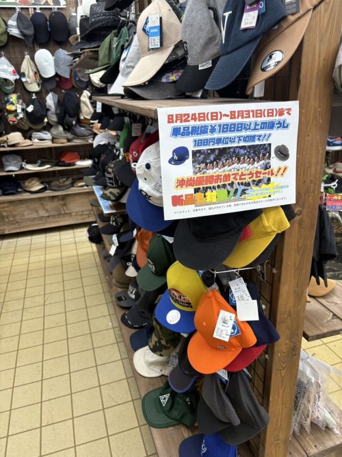 202508.24 イベント情報 沖縄尚学夏の甲子園優勝おめでとうセール! 新着・ファッション 沖縄尚学夏の甲子園優勝おめでとうセール! ただいま帽子コーナーにて100円単位以下切り捨てセール開催中! 単品税抜1000円以上の帽子が対象! 税抜2800円の帽子なら800円切り捨ての2000円+税で買えちゃいます! 新品も対象!8月31日まで! 夏の日差しに負けるなー! 鞄、靴コーナーショーケース内にも優勝おめでとう値下げタグ増産中!残りわずかな夏休みも泡瀬店でお得にお買い物!