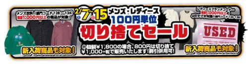 202602.07 イベント情報 端数切捨てSALE!! 2/7(日)~2/15(日)までの9日間限定‼ メンズ、レディースブランドコーナーの洋服が対象 レジにて税抜き価格より100円単位を切捨てし、 販売いたします 春物も日々入荷していますので 是非、泡瀬に遊びに来てください‼