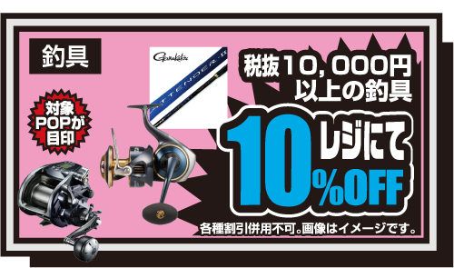202509.15 スポーツ 釣具 タックル強化キャンペーンSALE!! R7 9月15日~8月19日の期間限定で 釣具対象商品で 10000円(税抜き)以上のロッド・リールが レジにて10%OFF 対象ポップが目印です。 気になる方は是非マンガ倉庫泡瀬店釣り具コーナーまでお越しくださいませ!