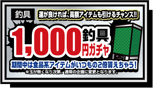 202503.08 スポーツ用品/釣具 釣具コーナー 1000円ガチャ絶賛稼働中! 一回1000円で、人気アイテムが当たる大チャンス!! 期間限定で食品系の景品が通常は1個までのところ3/16まで2個まで選べます! 釣具コーナーにて絶賛稼働中です!