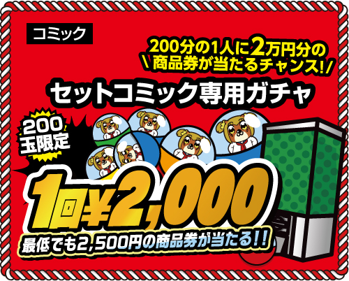 202511.08 イベント情報 20年の感謝を、特別な価格で。マンガ倉庫泡瀬店 11月8日より200玉限定!セットコミックガチャ★1回2000円! 大当たりは2万円分の商品券が当たるチャンス!!なんと!最低でも2500円分の商品券を投入!!この機会にセットコミックガチャを回してください!! ※現金専用。返金・交換などは行っておりませんのでご了承ください。 11月10日~14日ウィークリーセール!一番お安いアイテムがレジにて無料!! 11月15・16日2日間限定!税込550円以下の雑誌がレジにて半額!!