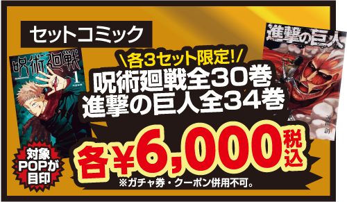 各3セット限定!呪術廻戦全30巻・進撃の巨人全34巻!税込、各¥6000販売!!