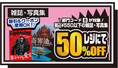 コード⑧が対象!税込¥550以下の雑誌・写真集がレジにて50%OFF!!絶対買うべし!!