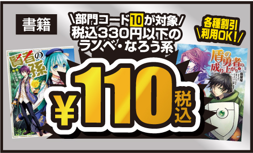 コード⑩が対象!税込¥330円以下のラノベ・なろう系がレジにて税込¥110販売!!是非!お見逃しなく!!