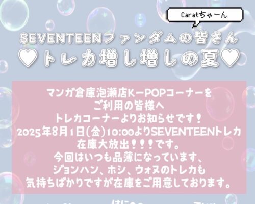 202507.28 新着情報 KーPOPコーナーからトレカ大放出のお知らせ! 8月1日スタート!SEVENTEENその他メンバーも在庫大放出!! 2023年以降のCD特典トレカもご用意!全メンバーではありませんが、数多く品出し予定です!
