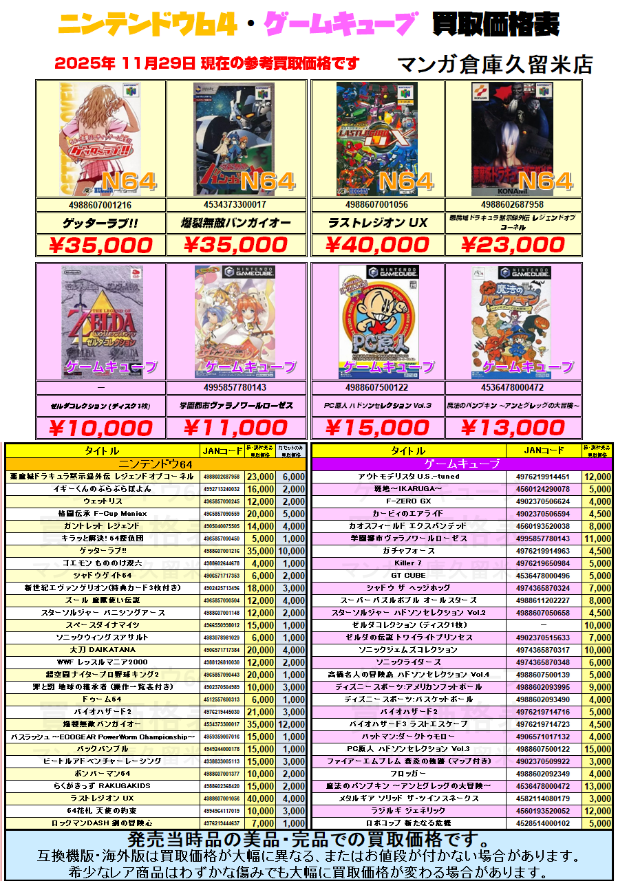 『ニンテンドウ64』『ゲームキューブ』買取価格表 買取価格が変わる、マンガ倉庫が変える