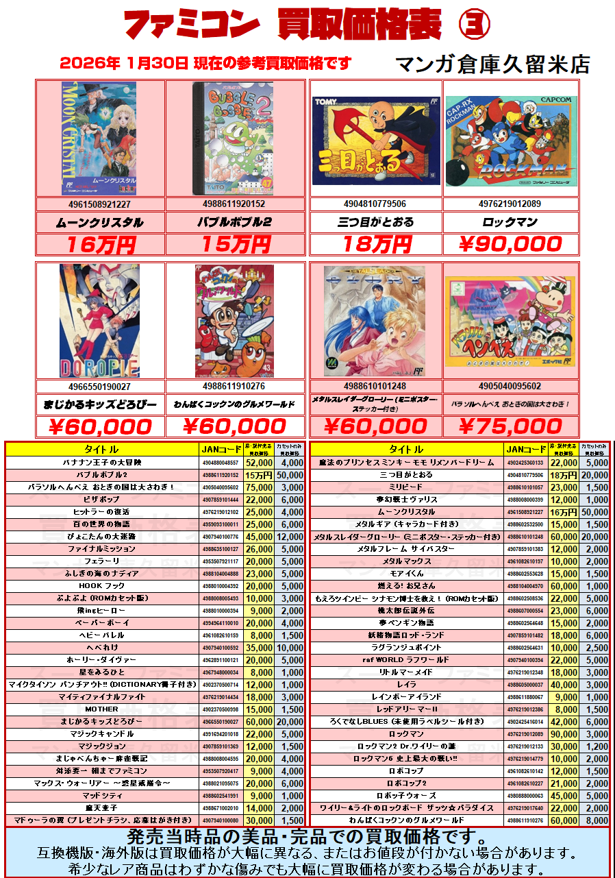 『ファミリーコンピュータ』買取価格表③ ファミコン地域一番買取強化中!