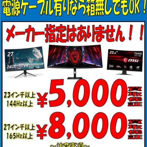 ゲーミングPCモニター買取強化中です!電源ケーブル有りで綺麗な状態なら箱無しでもOK!