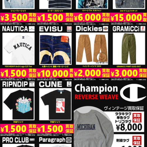アメカジ・ストリートブランド強化買取中!! Ron Harman/FRED PERRY/NAUTICA/EVISU/SCRIPT 花旅楽団/RRL/Dickies/GRAMiCCi/RIPNDIP/CUNE/PRO CLUB/Paragraph/Champion REVERSE WEAVE 買取保証