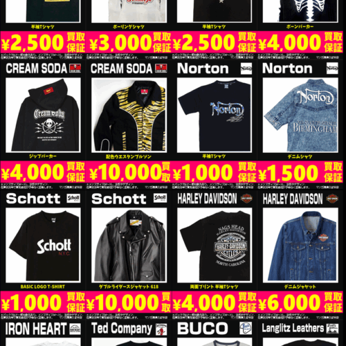 ロカビリー・バイカーブランド強化買取中!! CREAM SODA/VANSON/Norton/Schott/IRON HEART/Ted Company/HARLEY DAVIDSON/BUCO/Langlitz Leathers 買取保証