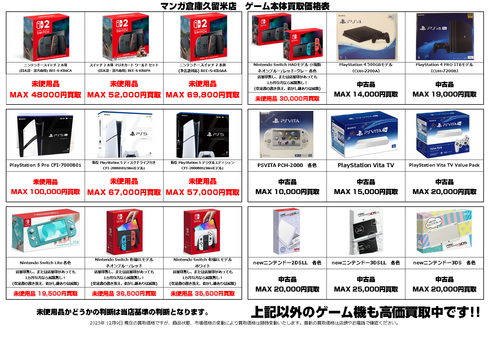 NEWゲーム機本体 買取価格表! 最新ハードの買取はマンガ倉庫久留米店におまかせ!