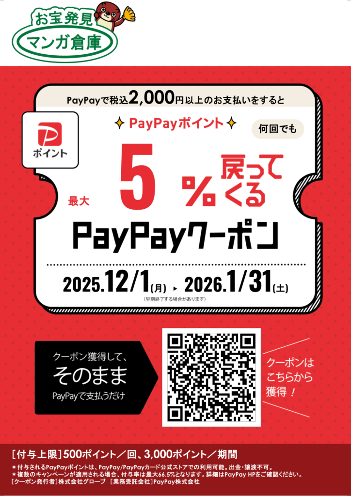 202511.30 イベント マンガ倉庫久留米店でPayPayでお支払いをするとPayPayポイント5%戻ってくるクーポン配布中! 2025年12月1日~2026年1月31日の期間中、当店でPayPayで2000円以上のお支払いすると PayPayポイント 最大 5% 戻ってくる! PayPayクーポン配布中! ぜひこの機会にマンガ倉庫久留米店へご来店くださいませ!