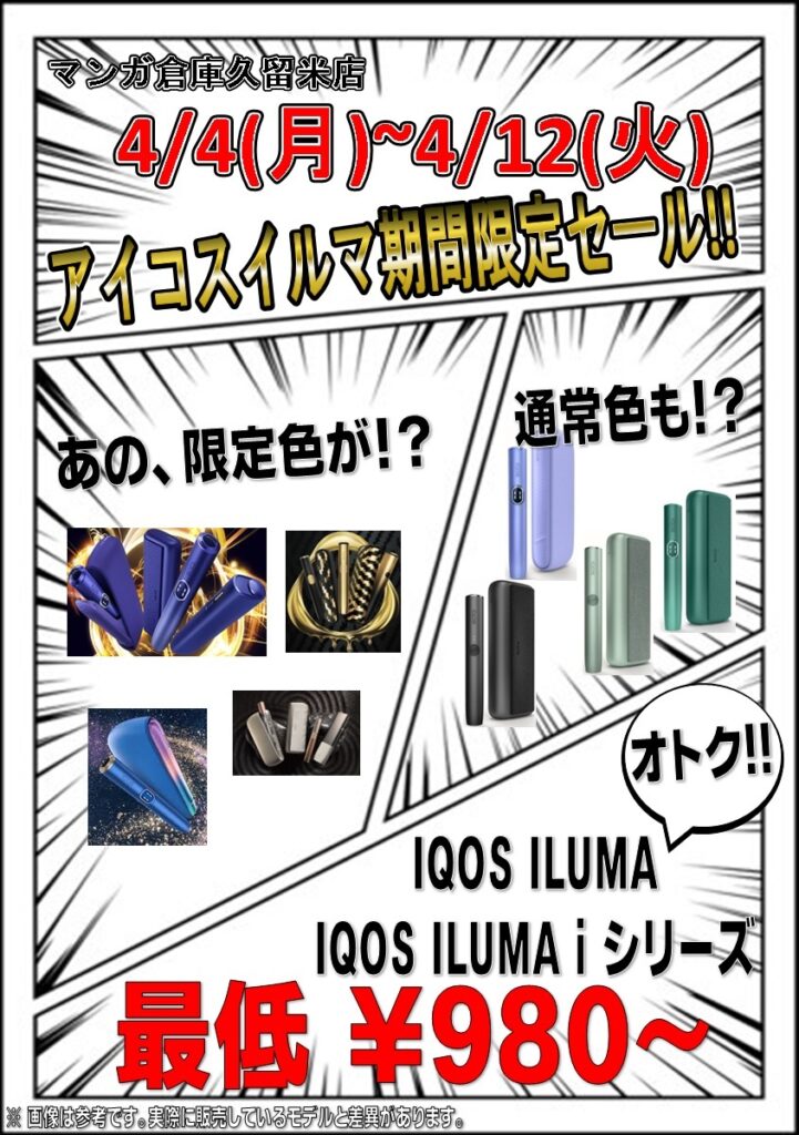 202604.06 セール 家電コーナーよりIQOSセールのお知らせ♪ ただいま数量限定で、IQOSのセールを開始しています!!色んなカラーがありますので好きな色を手に入れよう! 買取にも力を入れておりますので中古から未開封品までジャンジャン買取ります!!