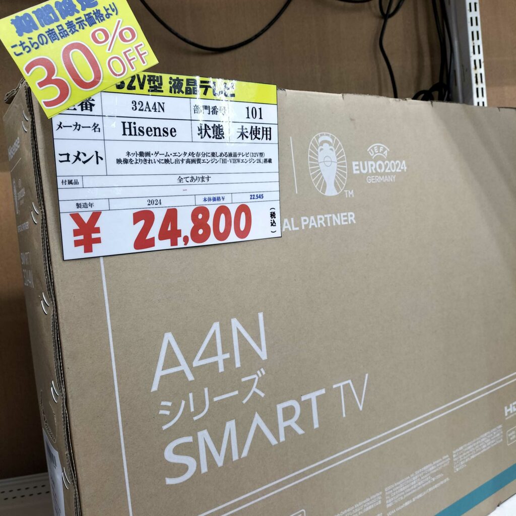 202604.08 セール 未使用のHisense 32型液晶テレビが¥24,800 から30%OFFの¥17,360 で販売中! 現在、未使用のHisense 32型液晶テレビが¥24,800 から30%OFFの¥17,360 で販売中!こんなに安いのは今しかない?!他にも最大30%OFFのセールを行っております。ぜひ一度当店にお越しくださいませ!