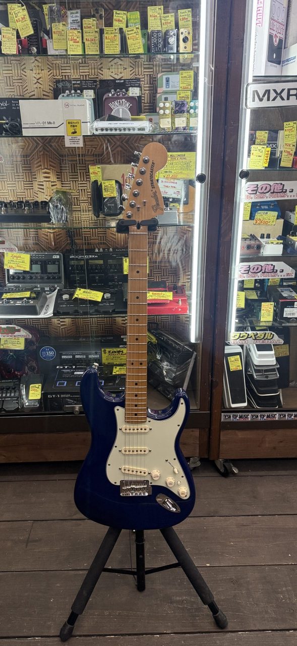 フェンダーメキシコ製の”スクワイヤー”シリーズストラトキャスター。現行品の中国製とは異なり、四角ペグや1プライピックガードがメキシコ製です。ポプラボディ/1ピースメイプルネック&指板仕様。比較的軽めの個体ですがトレブリーなサウンドで、コストパフォーマンスモデルとは言え味わいのあるトーンです。