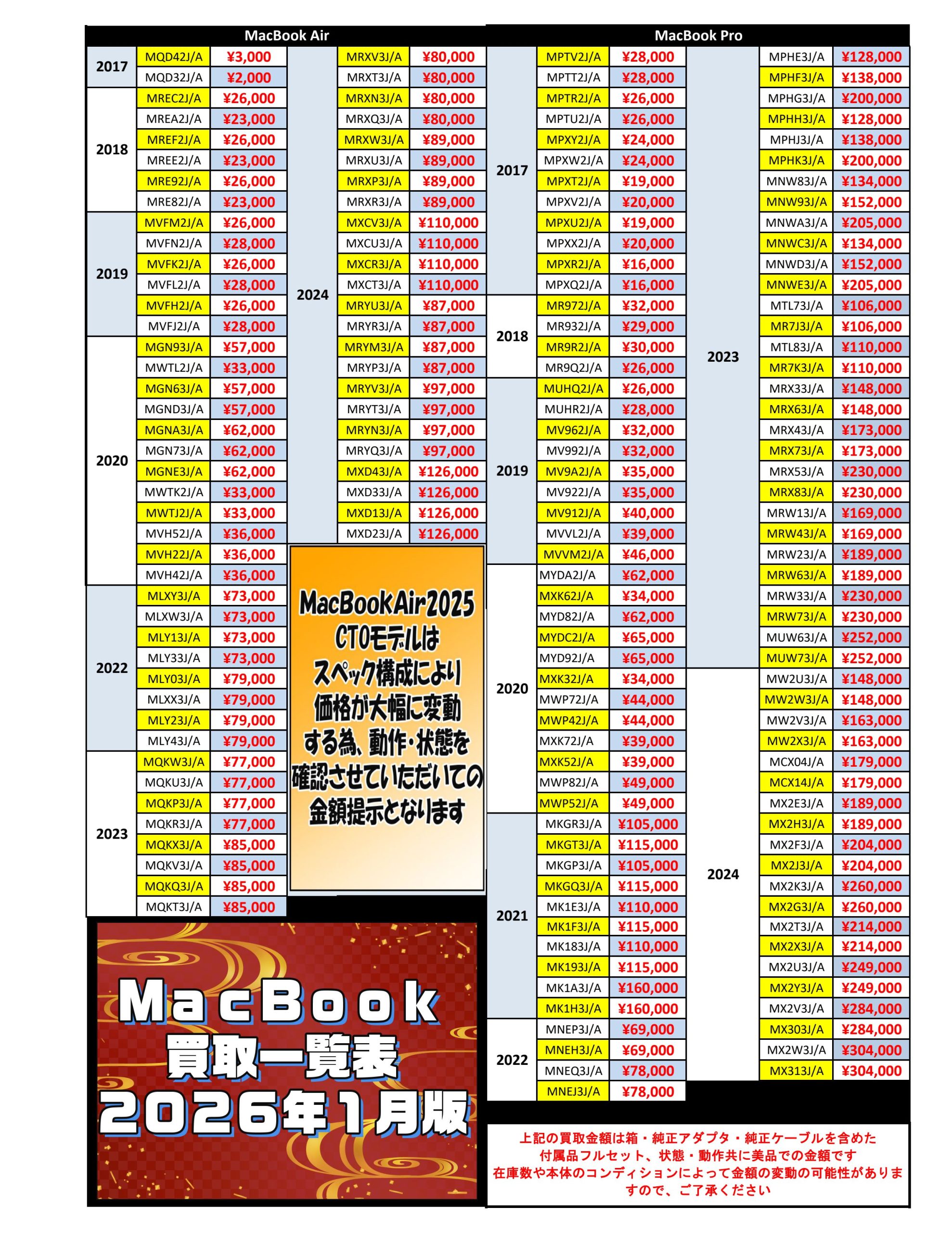 MacBook買取一覧表 2026年1月版