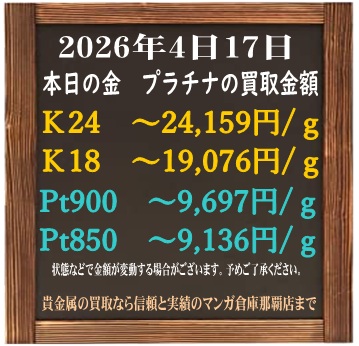 202604.17 金/プラチナ 本日の金/プラチナの買取価格! 年中無休でいつでも無料査定 貴金属買取ならおまかせマンガ倉庫那覇店 20年間の買取実績数が県内最大級である秘訣!! ぜひ他店と比べてみてください!!