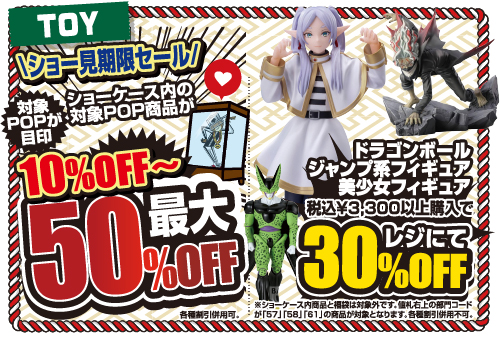 202412.27 おもちゃ 【おもちゃ】お正月セール!! R.6 12/28日(土)~1/5(日)の期間中 おもちゃコーナーにてお得なセール開催します!! 期間中は 【ジャンプ系フィギュア】【美少年フィギュア】【ドラゴンボールフィギュア】がお買い得になります!! ショーケース外にある対象商品を税込み¥3,300-以上お買い上げで30%OFF!! 更にショーケース内には最大50%OFFのPOPも出現⁉