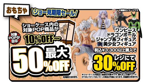 202602.13 おもちゃ 【おもちゃ】バレンタインセール R.8 2/14日(土)~R.8 2/22(日)の期間中 おもちゃコーナーにてお得なセール開催します!! 期間中は 【ワンピース系フィギュア】【ジャンプ系フィギュア】【美少年フィギュア】【ドラゴンボールフィギュア】がお買い得になります!! ショーケース外にある対象商品を税込み¥3,300-以上お買い上げで30%OFF!! 更にショーケース内には最大50%OFFのPOPも出現⁉