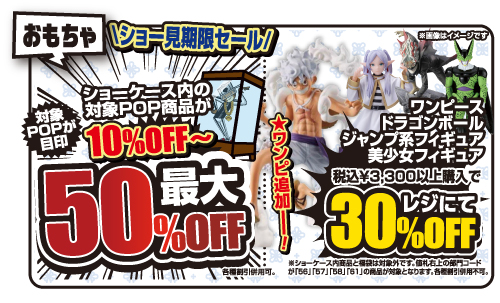 202509.12 おもちゃ 【おもちゃ】秋休みセール R.7 9/13日(土)~9/21(日)の期間中 おもちゃコーナーにてお得なセール開催します!! 期間中は 【ワンピース系フィギュア】【ジャンプ系フィギュア】【美少年フィギュア】【ドラゴンボールフィギュア】がお買い得になります!! ショーケース外にある対象商品を税込み¥3,300-以上お買い上げで30%OFF!! 更にショーケース内には最大50%OFFのPOPも出現⁉