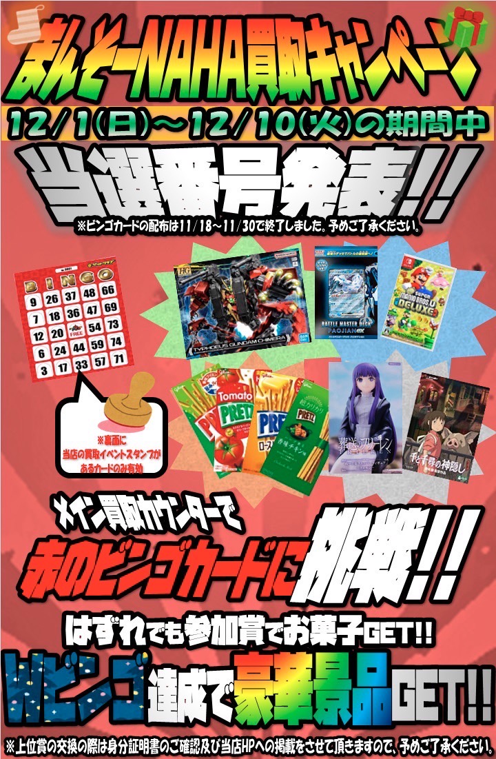 202412.01 イベント 【イベント】買取ビンゴチャレンジ抽選番号発表! 本日よりメイン買取にてビンゴの抽選番号発表です! 12/1(日)~12/10(火)の期間中に店内メイン買取支払いカウンター横にて番号発表! ビンゴ成立で景品ゲット!※ハズレても参加賞あり! ダブルビンゴ成立で豪華景品ゲット!! ※ダブルビンゴ賞は先着順になります。※ダブルビンゴ賞が無くなった場合はビンゴ賞となります。 ビンゴカードゲットされた方!是非この機会にチャレンジしてみて下さいね★