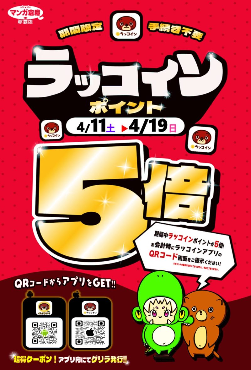 4/11(土)~19(日)までラッコイン5倍です!ポイント貯めてお得にお買い物するならマンガ倉庫那覇店へ!